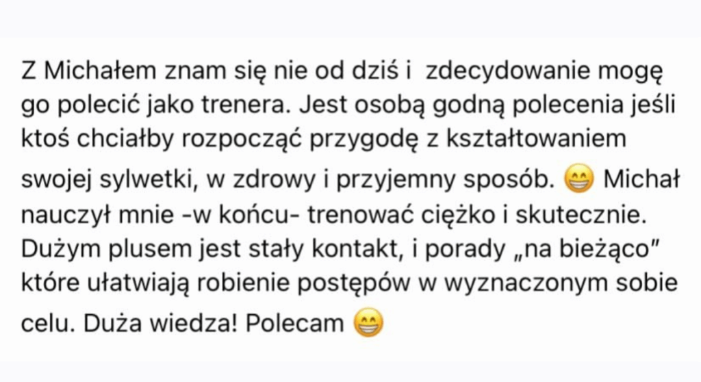 Czujesz, że czas na zmiany, ale nie wiesz, od czego zacząć? Jestem tutaj, aby Ci pomóc! Niezależnie od tego, czy chcesz zredukować tkankę tłuszczową, zwiększyć masę mięśniową, czy po prostu poczuć się lepiej w swoim ciele, dopasuję plan do Twoich indywidualnych potrzeb i możliwości.